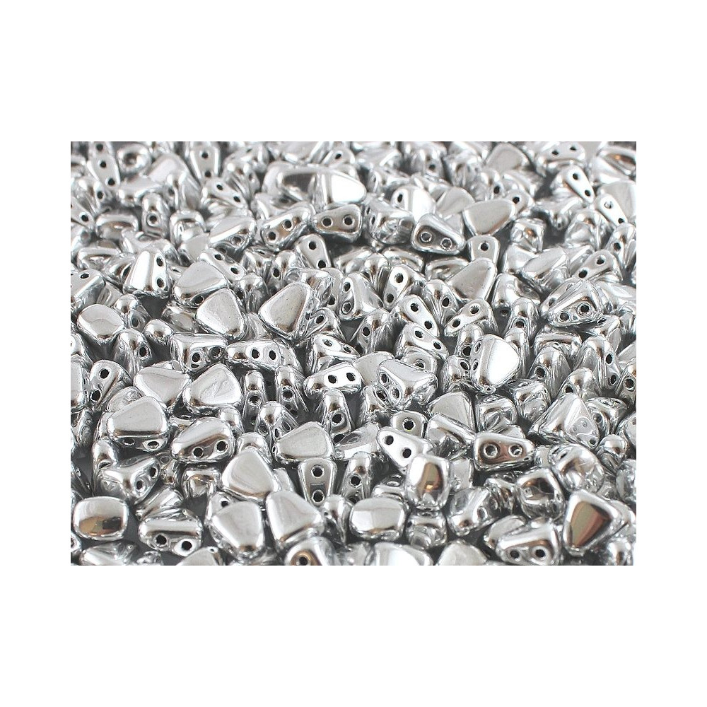 Polished chrome surfaces and architectural precision come together in these stunning silver two-hole beads. The unique wedge shape of these Matubo™ Nib-Bit components allows for seamless nesting, creating intricate, textured surfaces that catch every glint of light. By rotating the beads, you can achieve various geometric patterns, making them a versatile favorite for those who enjoy three-dimensional bead weaving.
