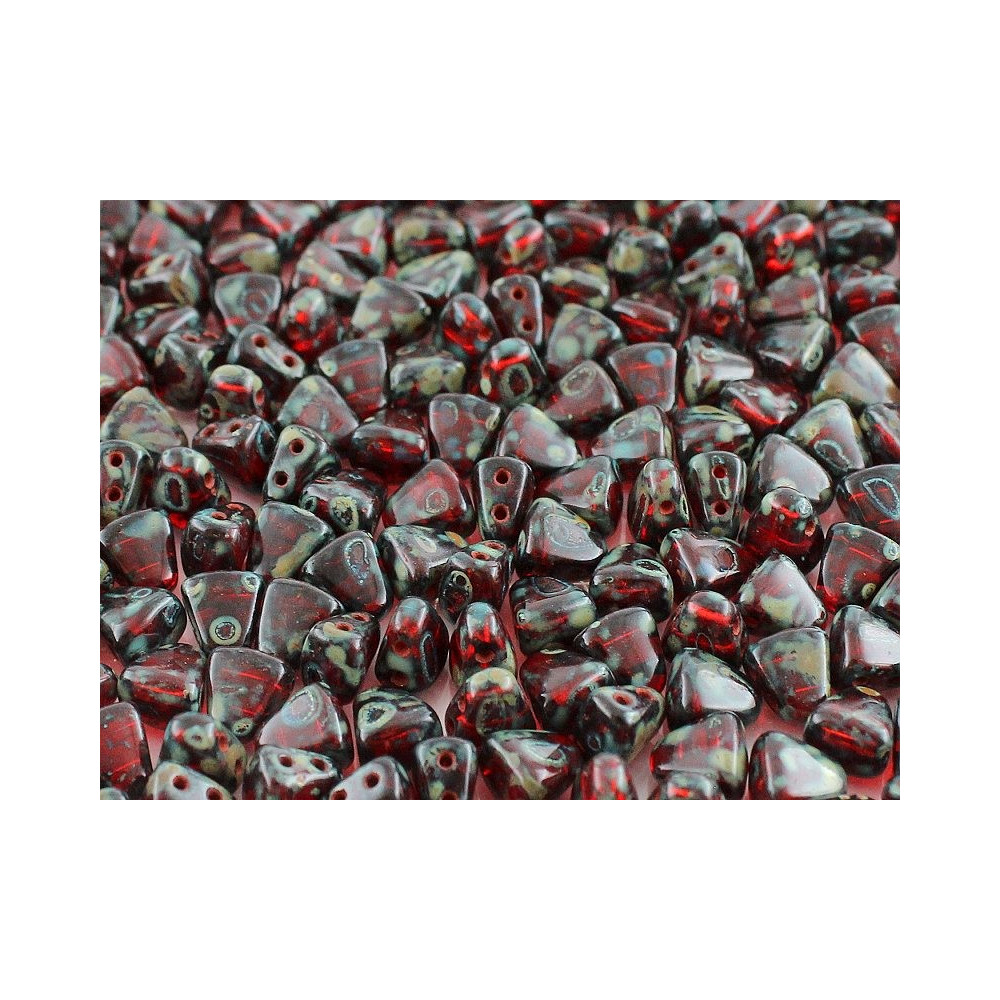 Deep transparent crimson tones meet an ancient, stony texture in these versatile wedge-shaped components that allow for seamless nesting. These Matubo™ Nib-Bit beads bring architectural depth to every bead weaving project, featuring a rich ruby red base enhanced by a dark travertine finish. For a striking contrast in your next necklace or bracelet, pair this earthy red hue with emerald green or let it glow harmoniously alongside orange hyacinth accents.