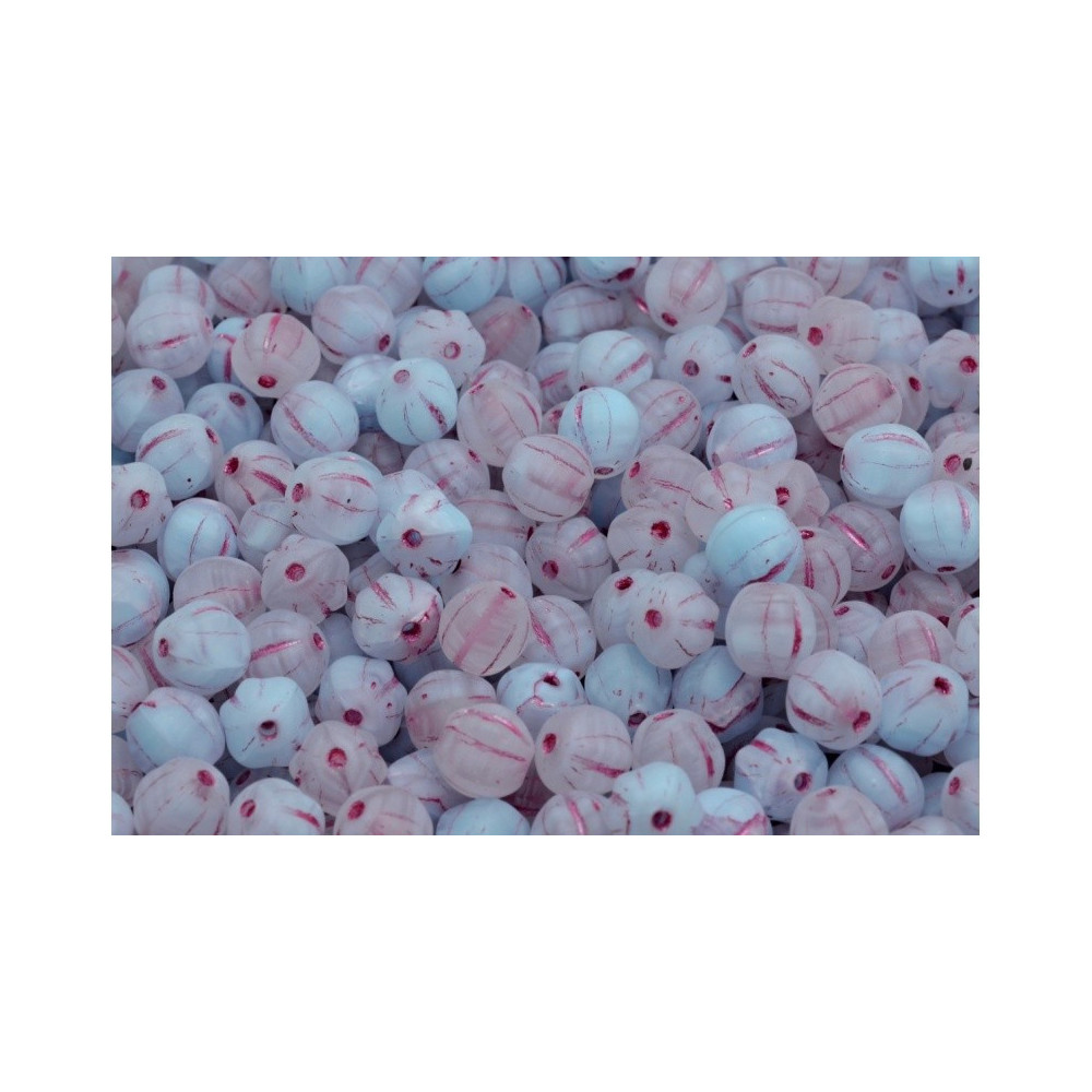 Soft pastel tones meet intricate textures in these Melon Beads 6 x 6 mm, offering a unique visual depth for your next artistic project. The light blue base is beautifully complemented by delicate pink accents nestled within the carved grooves, creating a sophisticated look reminiscent of antique treasures or rare botanical finds. These pressed glass beads are a staple for designers looking to add a touch of romanticism to their collections.