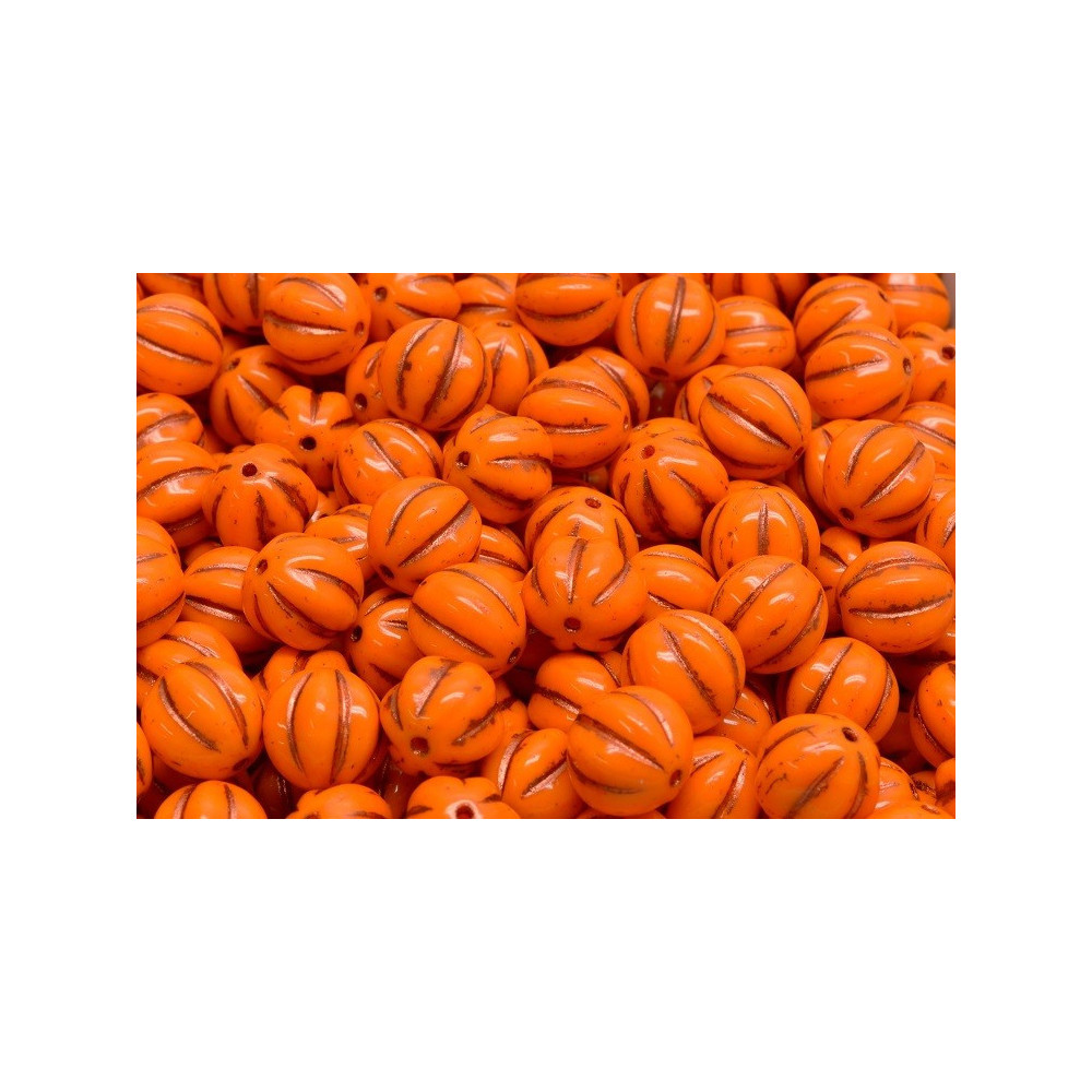 Vibrant orange opaque glass serves as the foundation for these exquisite Melon Beads 8 x 8 mm, featuring deep longitudinal grooves that are artistically defined with a metallic copper finish. Unlike standard smooth round beads, the melon shape adds a sophisticated tactile dimension and vintage character to any project. These handmade Czech glass beads are produced using traditional pressing techniques, resulting in a consistent form that mimics the organic look of carved fruit or pumpkin ribs, making them a staple for artisan creators.