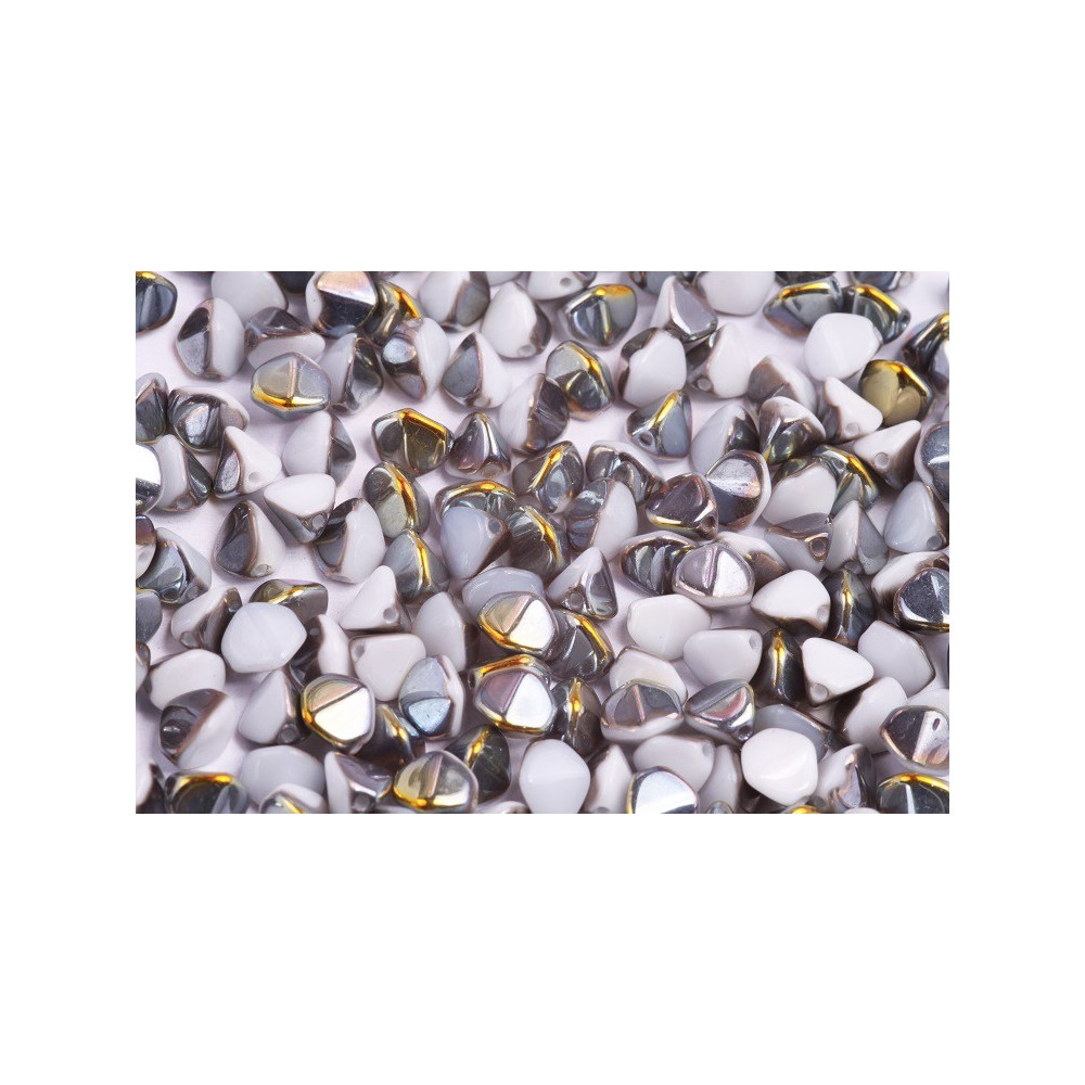 Opaque white glass serves as the elegant foundation for these stunning 7 mm Pinch Beads, featuring a half-coated metallic finish that reflects a spectrum of gold and silver tones. This Marea treatment adds a high-fashion, iridescent edge to the classic triangular shape, making them a staple for handmade Czech glass jewelry enthusiasts. Designers often utilize these geometrically unique components to add dimension and texture to woven structures or as striking accents in minimalist earring sets.