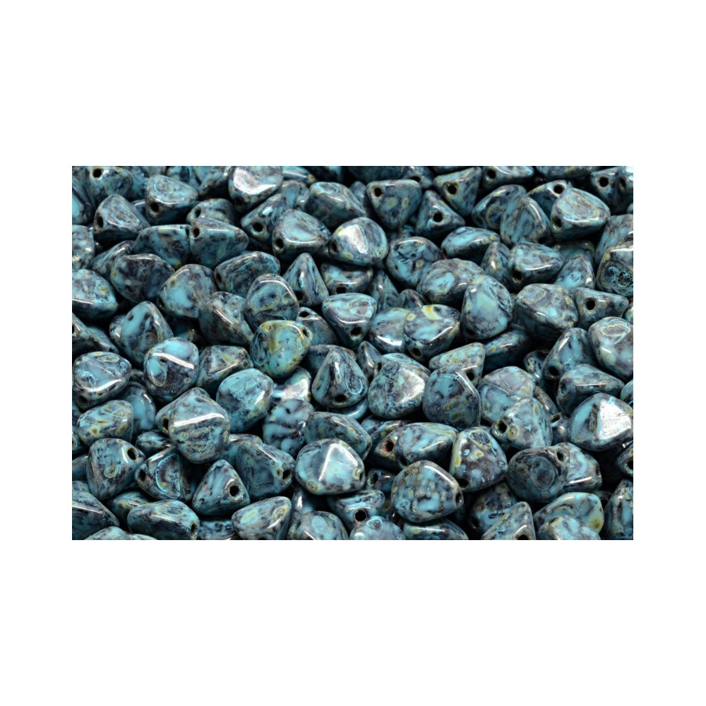 Teal and earthy mottled tones characterize the Picasso finish on these glass components, giving each piece a stone-like appearance reminiscent of ancient turquoise. This organic surface treatment interacts beautifully with light, alternating between semi-matte patches and deep glossy accents. Because they are handmade Czech glass, every bead carries subtle variations that contribute to a sophisticated, artisan look.
