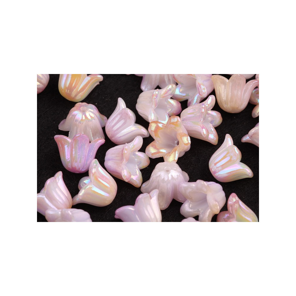 brighten your craft projects with iridescent plastic beads in the shape of flowers that are as magical as practical. These 10 x 15 mm beads bring a light game full and push your products to a new level. Ideal for making fine angel pendants , earrings or other decorations that will appeal to all ages.