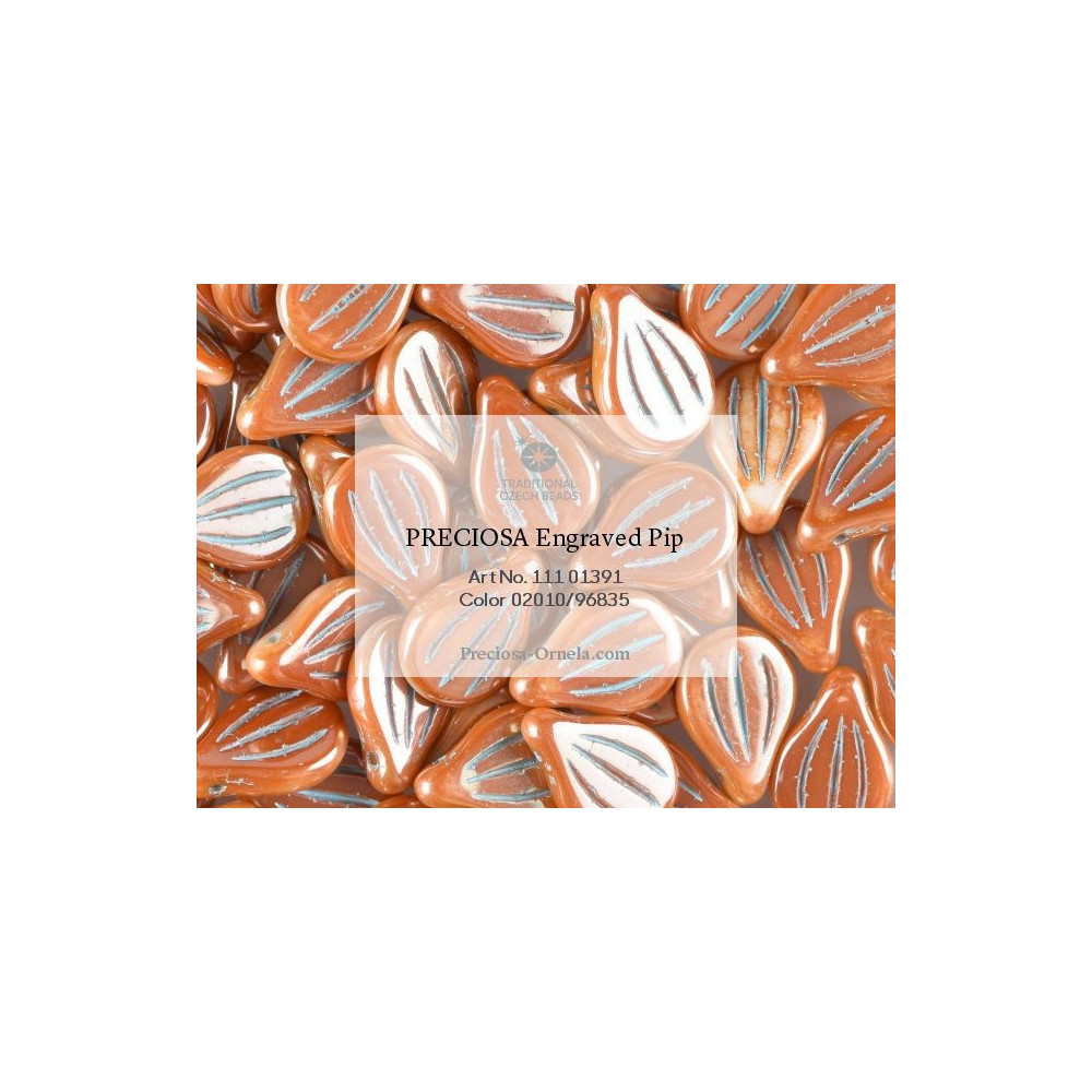 Preciosa Engraved Pip Beads size: 9x14 mm Bead hole size: 0.8 mm Price per pack: 6 pcs Color:...
