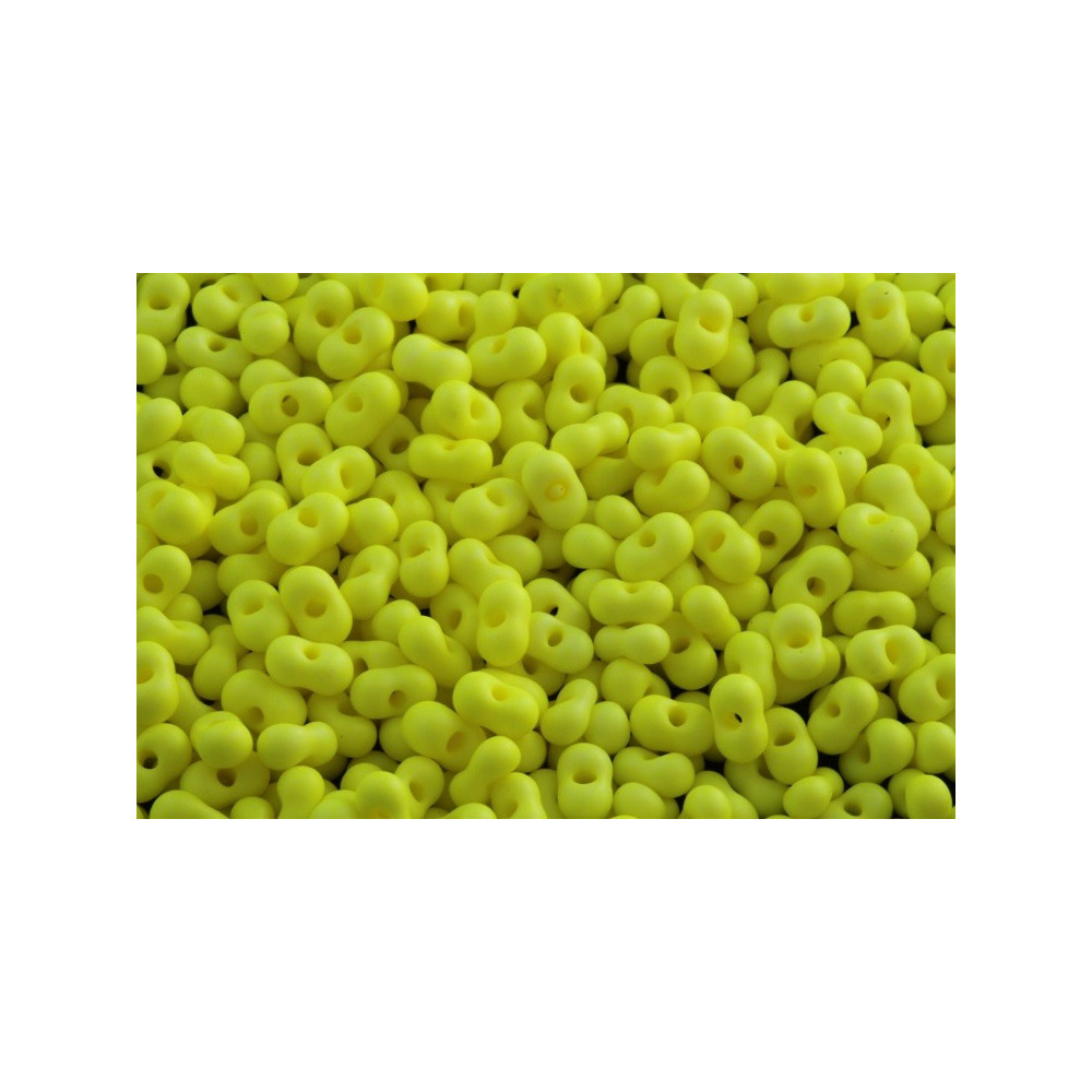 Neon yellow matte glass defines these distinctive 3.2 x 6.5 mm Farfalle beads, characterized by their unique figure-eight or "bow tie" shape. The central constriction allows these Preciosa beads to nestle together, creating a sophisticated pebbled texture in woven patterns that standard rounds cannot achieve. A 0.6–0.8 mm hole diameter is engineered to accommodate multiple thread passes through the bead, making them compatible with robust S-lon FIRE polyethylene threads for high-tension bead weaving projects.