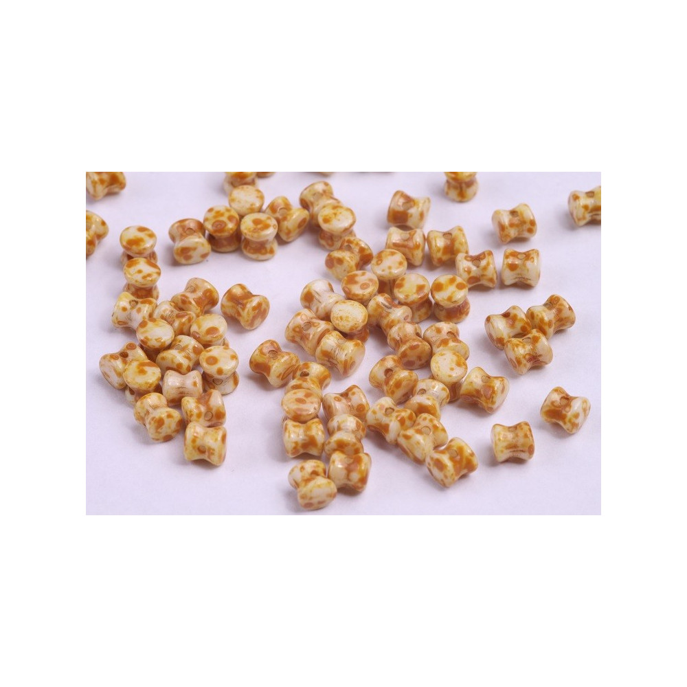 Envision a multi-strand necklace where unique shapes create a rhythmic texture, catching the light with every movement. These Preciosa Pellet beads feature a distinctive hourglass silhouette that allows them to nestle together in a honeycomb-like pattern or stand out as textured spacers. The White Bronze Fusion finish offers a sophisticated, organic look, blending a creamy base with warm mottled metallic accents that pair beautifully with fire polished beads for added sparkle. For a striking contrast, we suggest pairing this earthy bronze palette with deep teal or vibrant turquoise elements to make the metallic flecks truly pop.