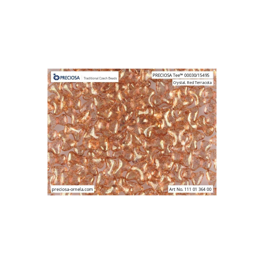 T-shaped geometry defines the Preciosa Tee™ collection, offering a unique profile that measures 2x8 mm with a central 0.8 mm hole. These Czech glass beads are manufactured with a tapered silhouette that allows them to interlock seamlessly when used in vertical or horizontal rows. The 00030/15495 colorway features a transparent crystal base enhanced by a warm, mottled red terracotta luster finish that adds an organic feel to the glass.