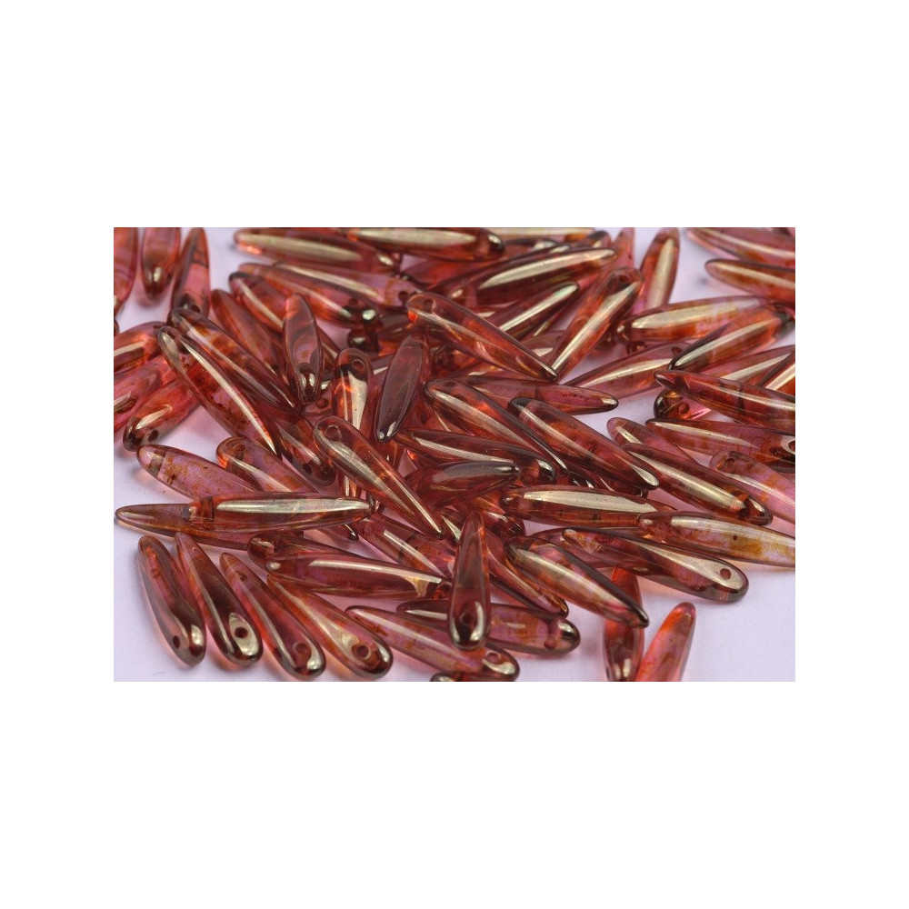 Red transparent glass meets a rustic finish in this versatile component, ensuring each piece carries a unique, organic charm. The elongated 5x16 mm profile makes them the perfect candidates for edge detailing, where you can pair them with Preciosa seed beads as a base with Thorn pendants on the edges to create stunning Victorian-style collars or modern spikes. For a striking contrast, pair with dark sapphire beads to highlight the warm, coppery tones of the Picasso finish.