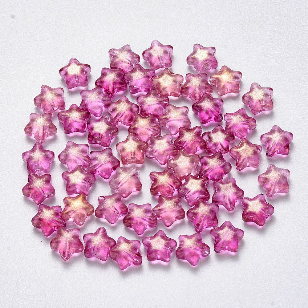 Illuminate your handmade collections with these exquisite star-shaped glass beads. Each bead features a vibrant, translucent fuchsia hue that is beautifully contrasted by a shimmering golden luster at its core. These beads capture the magic of a night sky, making them an essential component for celestial-themed jewelry and whimsical everyday accessories.