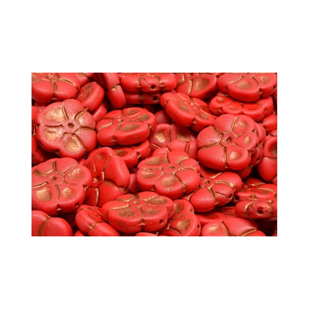 Coral red tones meet the antique warmth of metallic copper in these stunning floral components. These Primrose Beads 15 x 15 mm represent the pinnacle of Czech glass craftsmanship, utilizing traditional pressing techniques that have been perfected over centuries. The base glass is an earthy, saturated red that provides a solid foundation for complex jewelry making projects, offering a natural yet sophisticated aesthetic for designers.