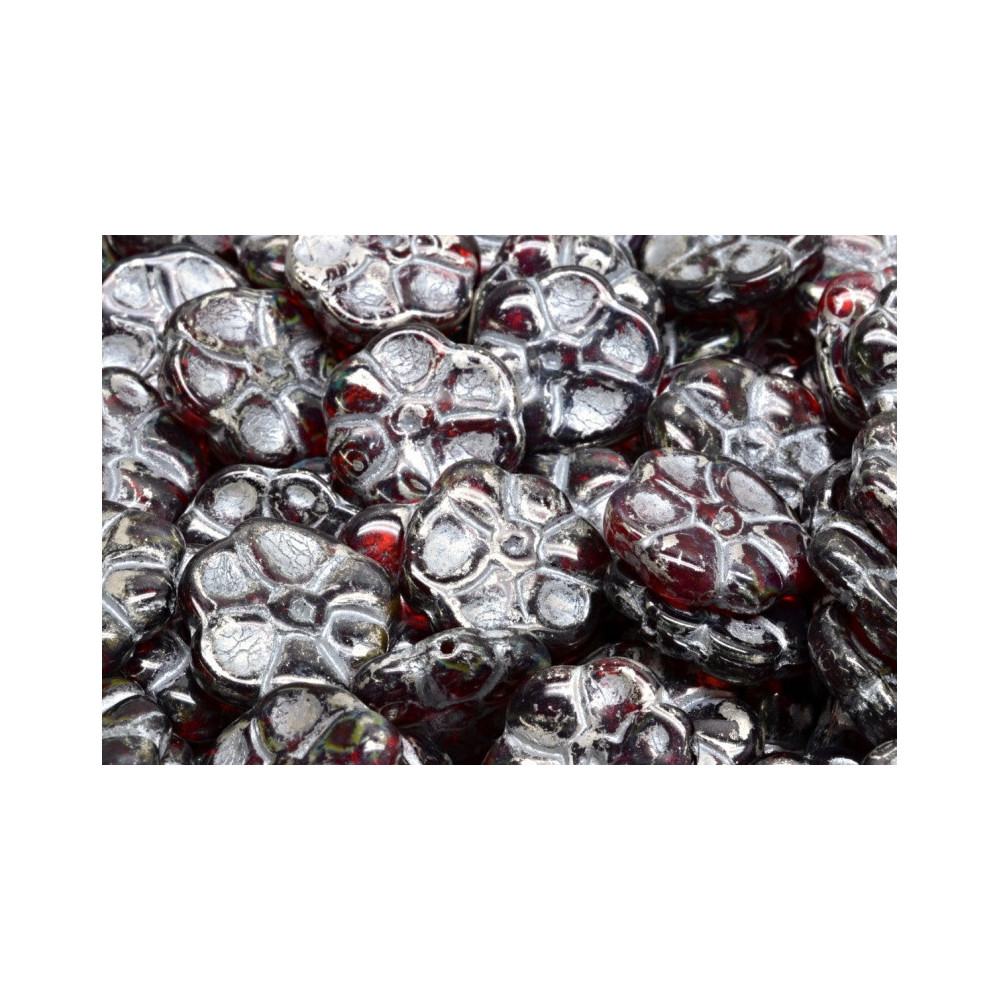 Deep within the heart of the Crystal Valley, the tradition of pressed glass artistry continues to thrive through pieces like these Primrose Beads 15 x 15 mm. Each bead is carefully molded to capture the delicate silhouette of a spring flower, reflecting centuries of Bohemian craftsmanship. The rich transparent red glass is enhanced by a signature Picasso finish, which adds a mottled grey patina to the textured surfaces, giving every blossom a unique, aged character that speaks of heritage and timeless beauty.