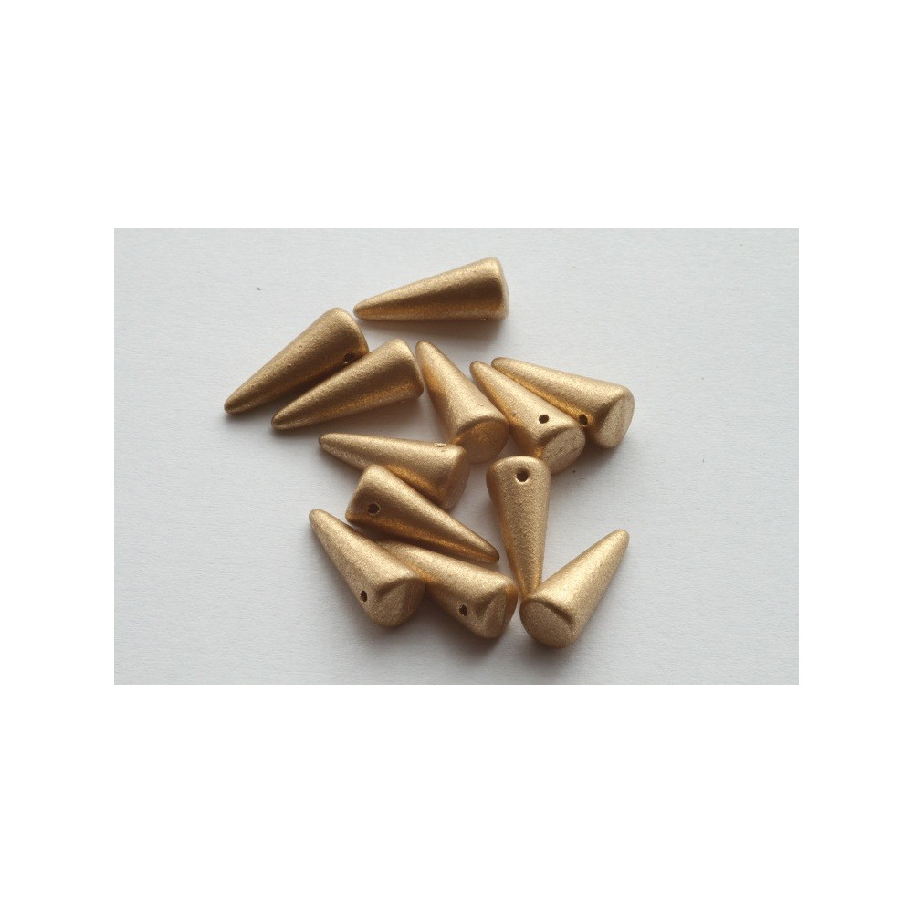 Unleash your creative potential with our exquisite Spike Beads, meticulously crafted by the renowned Czech manufacturer Rutkovský. These striking beads boast a sleek, elongated conical shape that is perfect for adding a bold and dynamic touch to your jewelry designs. The glossy Gold finish of these high-quality pressed glass beads radiates sophistication and luxury, making them an exceptional choice for edgy, statement pieces as well as gothic-inspired jewelry and contemporary fashion accessories.