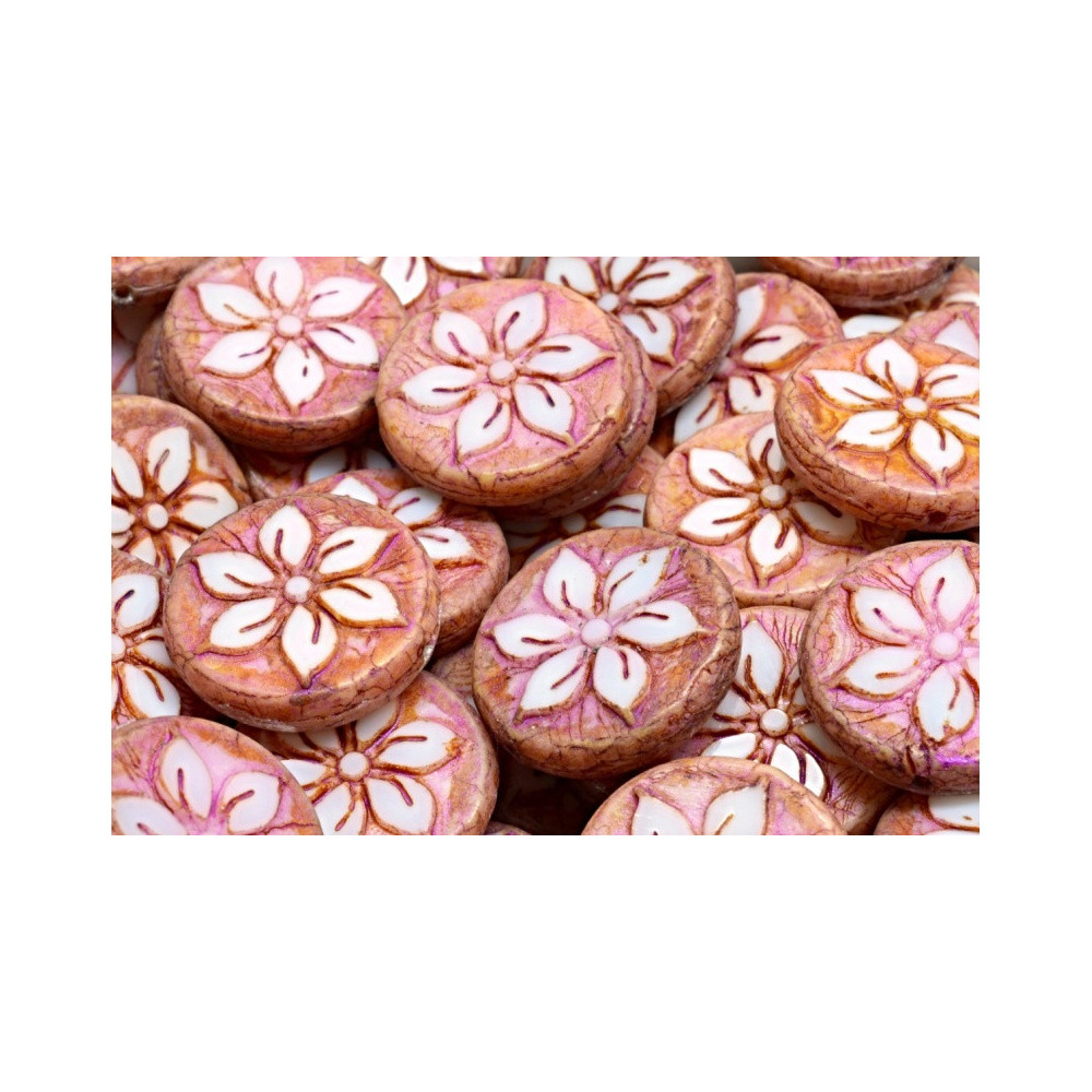 Immerse yourself in the artistry of Czech craftsmanship with the exquisite TCB Flower Coin Beads from Rutkovský. Each bead, meticulously fashioned through traditional pressed-glass methods, showcases a stunning floral motif that brings an enchanting elegance to your jewelry creations. With a generous size of 18x18mm, these violet-hued beauties serve as striking focal points in necklaces, bracelets, or statement earrings, while maintaining the versatility to act as delicate accents in beadweaving or mixed-media projects.