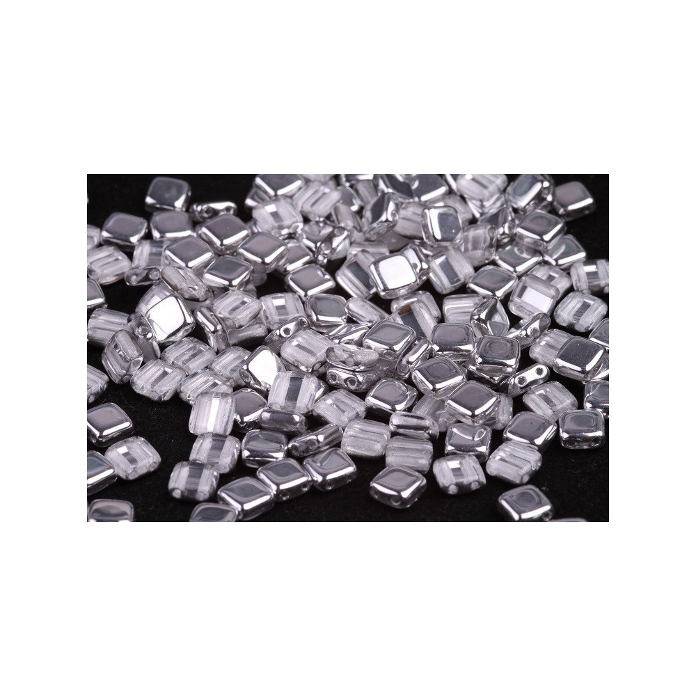 Metallic silver tones meet the clarity of Czech glass in this sophisticated Crystal Labrador finish. The half-coated surface provides a stunning contrast between the bright, reflective chrome front and the subtle transparency of the glass base. When used in a multi-row wrap bracelet, these two-hole beads provide a contemporary, industrial-chic aesthetic that pairs beautifully with leather cords or high-quality Preciosa seed beads in sizes 8/0 or 11/0.