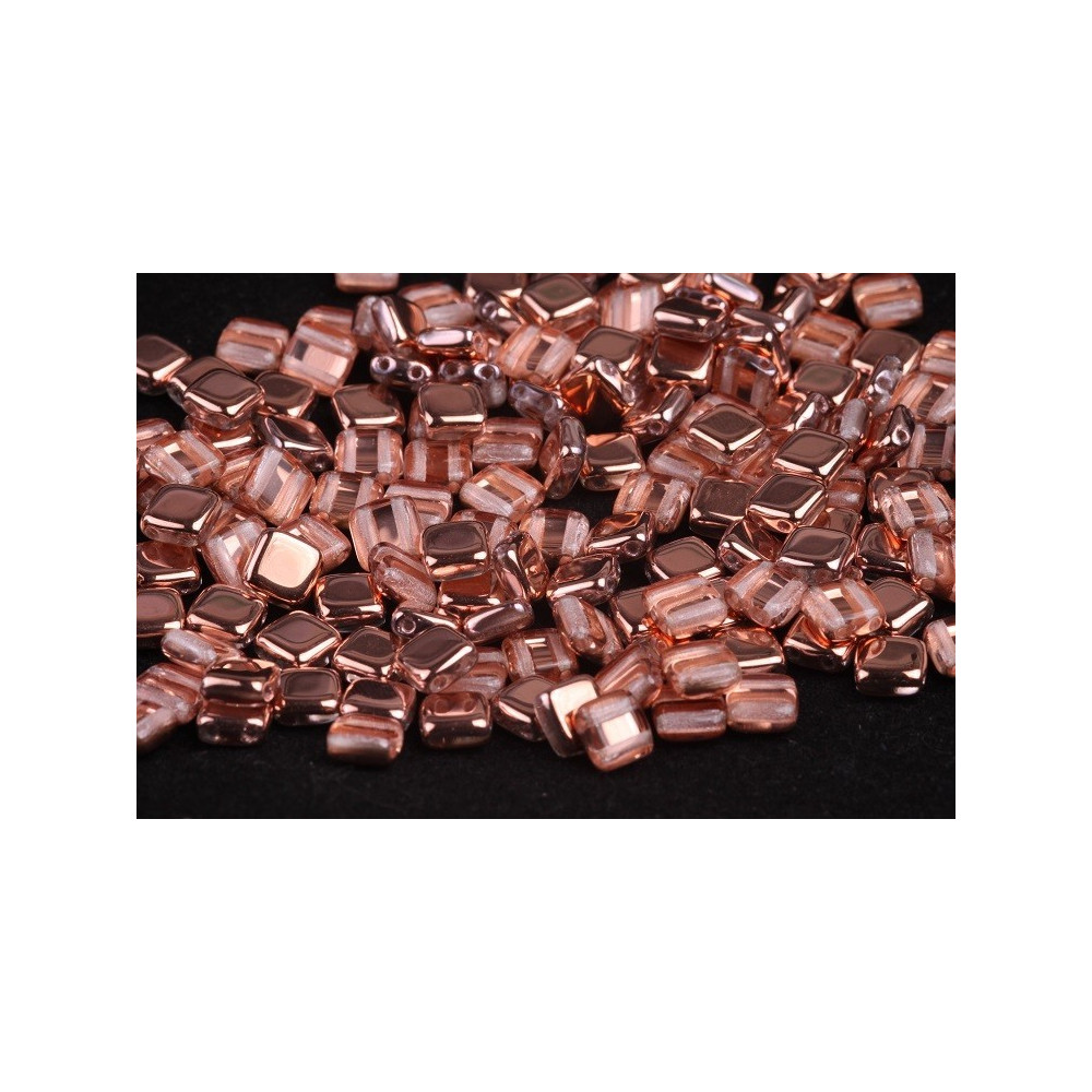 Precision-engineered Tile Beads measuring 6 x 6 mm feature a versatile two-hole design essential for advanced geometric beadwork and multi-row constructions. Each bead is masterfully pressed by Rutkovsky using traditional Czech glass techniques, ensuring the parallel 0.7 mm holes maintain strict alignment for professional finishing. The metallic Capri Gold coating provides a sophisticated rose gold luster over a clear crystal base, offering a warm, high-end aesthetic to any jewelry project.