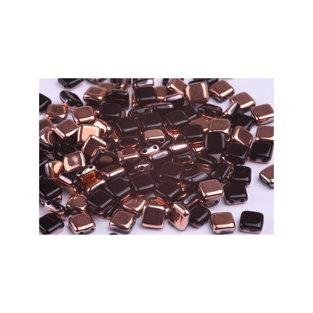 Jet Capri Gold presents a sophisticated dual-tone effect where deep, opaque black glass meets a shimmering metallic rose-gold coating. These Tile Beads are produced through traditional glass pressing, a technique perfected by the Rutkovsky family over generations in the heart of Northern Bohemia. The precise 6 x 6 mm square shape provides a flat, structural base that is essential for modern geometric beadwork and multi-row bracelet designs.