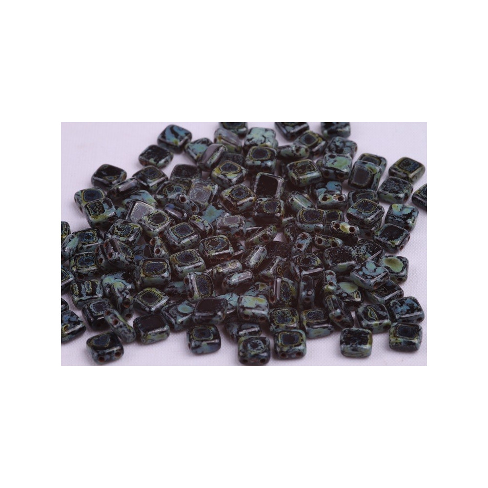 Jet black glass serves as the mysterious foundation for the travertine finish, which adds a rustic, stony character to each bead. These two-hole Tile Beads are hand-pressed by the Rutkovsky family, maintaining a traditional Czech glassmaking heritage that results in superior quality and uniform sizing. The earthy teal and mossy tones within the finish create a beautiful contrast against the glossy black glass, ideal for vintage-inspired color palettes.
