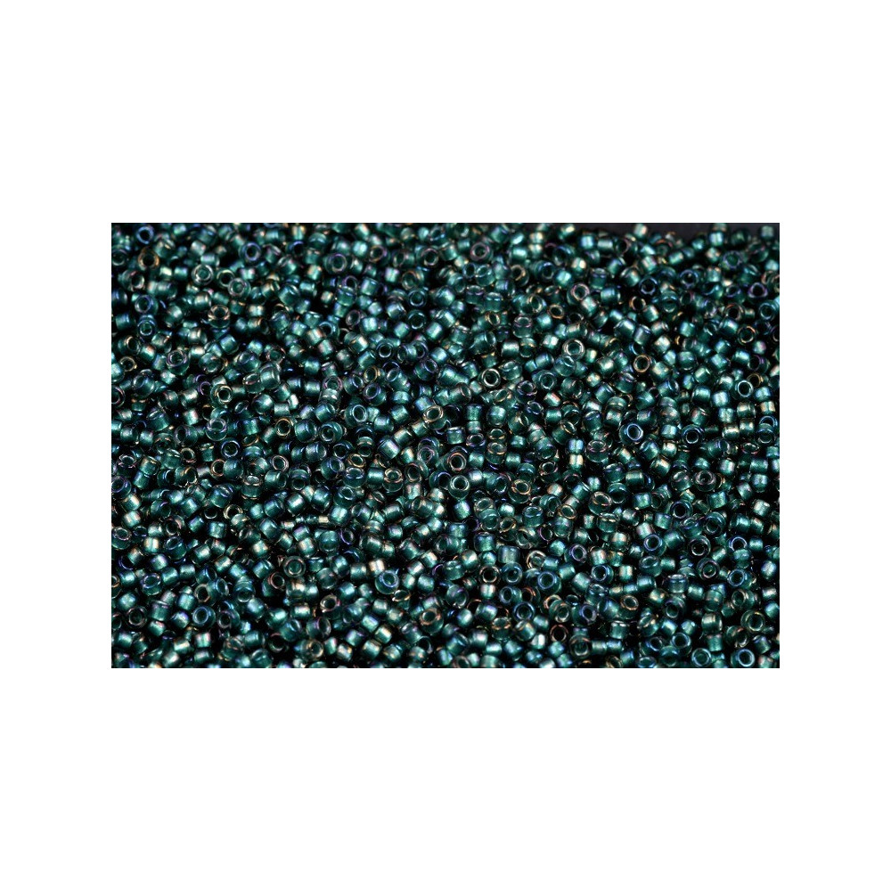 Prairie green tones shimmer within a crystal glass exterior, creating a rich visual texture that mimics the depth of a forest canopy. These TOHO seed beads 15/0 are essential for designers seeking to add organic, sophisticated color to their wearable art. The inside-color technique provides a unique optical effect where the green core appears to glow from within the transparent glass shell, adding a professional dimension to any project.
