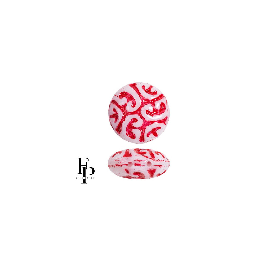 Vibrant red patterns dance across a milky surface in these exquisite two-hole components, perfect for adding a touch of antique charm to modern jewelry. These Vintage Cabochons FP Selection® offer a unique aesthetic that recalls classic European glasswork, providing a stunning focal point for necklaces or a repetitive pattern for statement bracelets. The intricate relief design on the surface of each 13mm round bead ensures that your handmade creations stand out with an artisan, high-end feel.