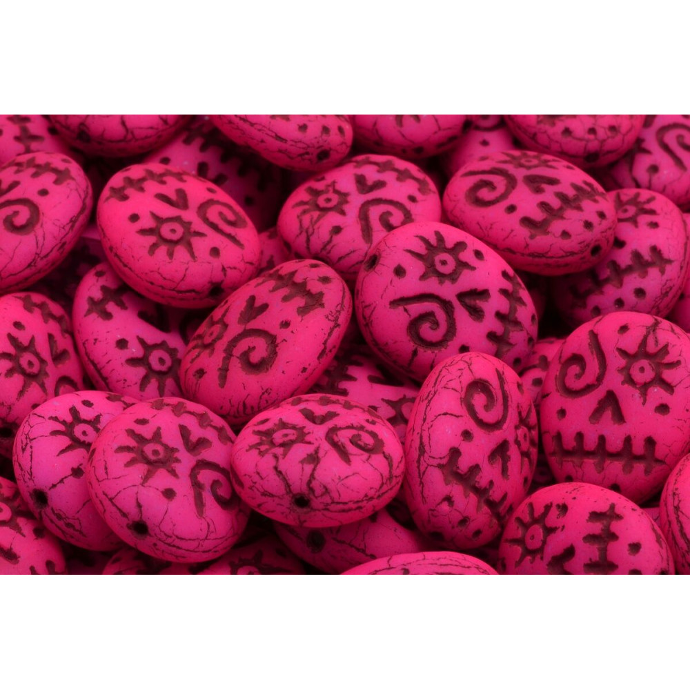 Vibrant fuchsia tones meet tribal engravings in these unique pressed glass pieces. The matte surface finish emphasizes the intricate face details and dark rustic wash, making each bead look like an ancient artifact. These Mask Beads are essential for designers seeking a bold, ethnic aesthetic in their jewelry collections.