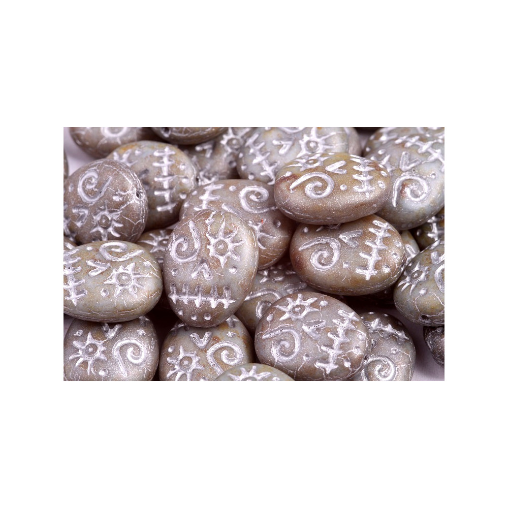 A unique stony grey finish defines these artisan Mask Beads, each featuring a whimsical tribal face engraving that adds character to any project. These oval pressed glass elements evoke an ancient, earthy feel, making them ideal for boho-chic earrings or as focal components in a mixed-media bracelet. The subtle silver wash within the engravings highlights the intricate details of the funny face design, ensuring each bead stands out as a miniature work of art.