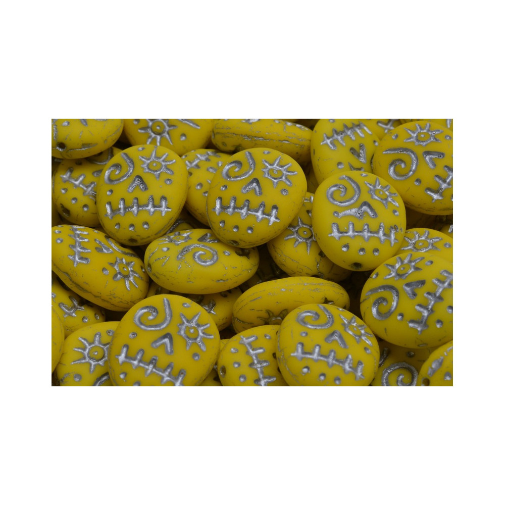 Vibrant sun-drenched yellow tones meet intricate tribal engravings to create these captivating focal pieces for your next jewelry project. The bold Yellow Mask Beads feature a unique voodoo-inspired face design, highlighted by a shimmering metallic silver wash that settles into every fine line and detail. These 16 x 13 mm beads offer a flat, pebble-like profile that ensures they sit perfectly against the skin in bracelets or necklaces.