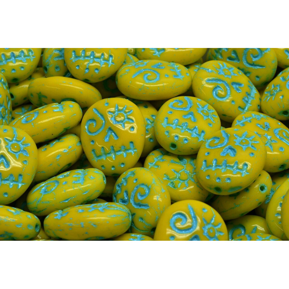 Yellow-toned base glass provides the foundation for these summer-inspired Mask Beads, featuring a distinctive "Funny Face" motif that highlights the precision of Rutkovsky mold-making. Each bead is artisanally finished with a turquoise wash that settles into the recessed engravings, ensuring every piece has a unique, aged appearance reminiscent of primitive artifacts. The 16 x 13 mm dimensions offer a substantial profile for focal points without adding excessive weight to finished jewelry, making them a staple for artisan bead supplies.