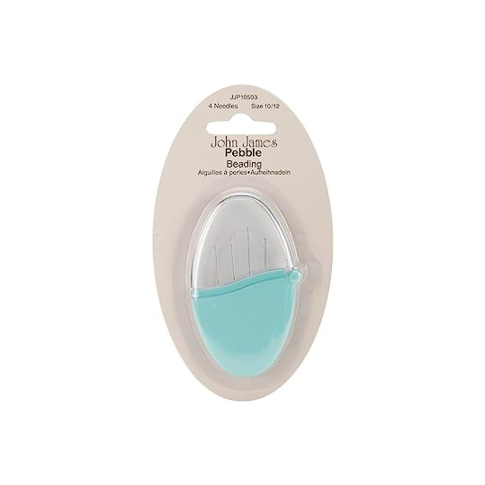 John James Pebble Beading Needles dans un assortiment polyvalent de tailles 10 et 12. Ces outils en acier de haute qualité sont spécifiquement conçus pour le travail de perles de précision et la fabrication de bijoux. Conditionnement : 4 aiguilles dans un étui de protection turquoise en forme de galet.