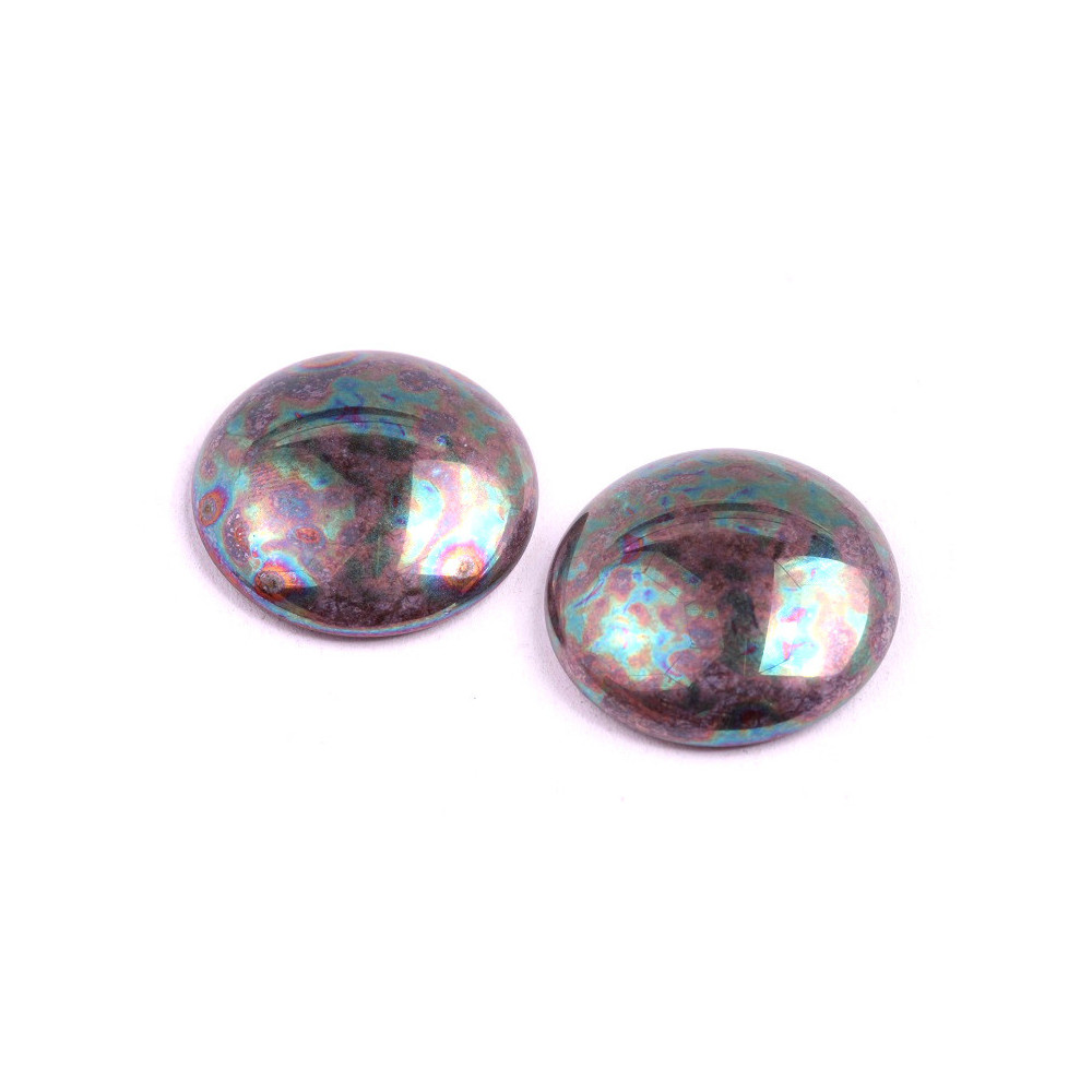 Des tons irisés chatoyants dansent à la surface de ces 25 mm Cabochon Beads, offrant une profondeur de couleur qui imite la beauté naturelle d'une nébuleuse lointaine. Cette pièce spécifique en verre de Bohême présente une base violet foncé riche, recouverte d'une finition métallique complexe qui reflète des nuances de sarcelle, d'or et de magenta. Fidèle à la tradition familiale Rutkovsky, chaque pierre est pressée à la main selon des techniques ancestrales pour garantir un dôme parfaitement lisse et un dos plat, ce qui en fait un candidat idéal pour la jewelry making de luxe.