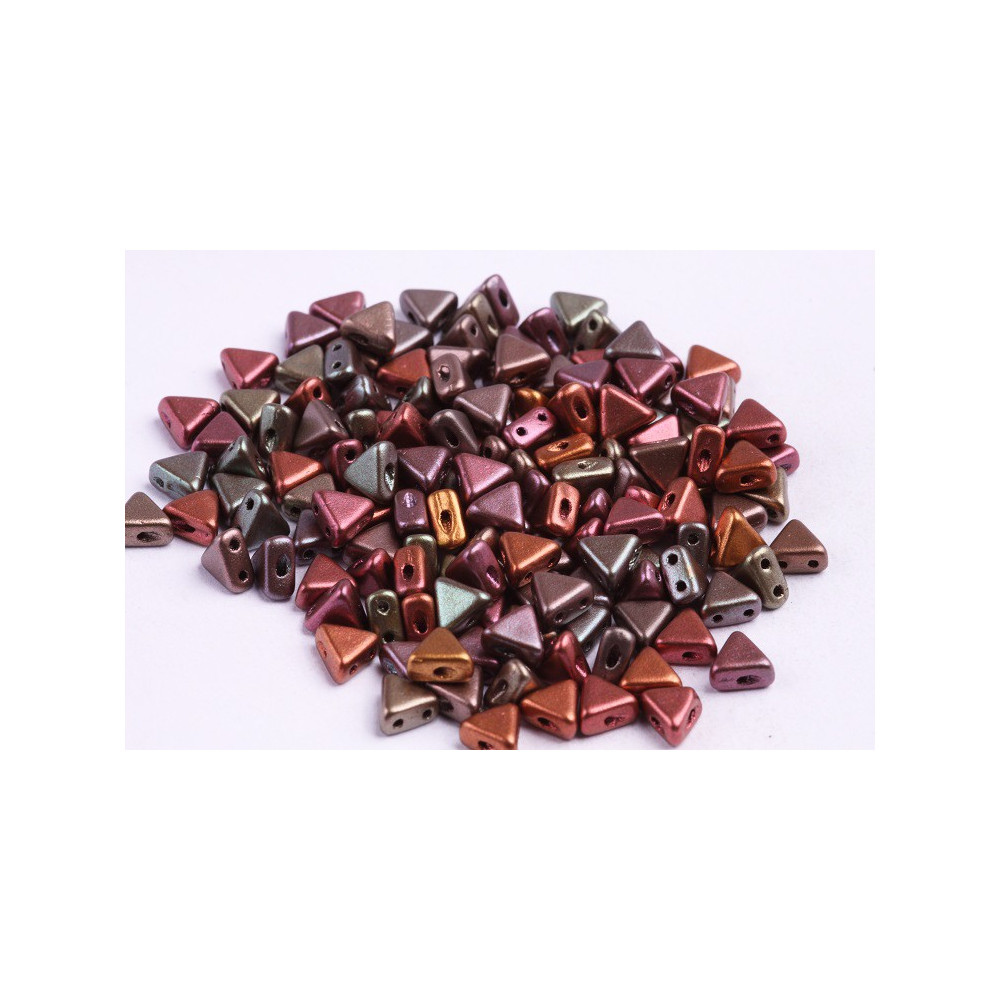 Avez-vous déjà imaginé un bijou d'une symétrie géométrique parfaite avec une finition chatoyante aux multiples reflets ? Ces perles en verre triangulaires présentent une palette sophistiquée de violets et de bronzes métalliques, ce qui en fait un incontournable pour les créateurs recherchant profondeur et polyvalence dans leur travail de perlage. La surface irisée réfléchit la lumière de manière à osciller entre le violet profond et le cuivre chaud, ajoutant une énergie dynamique à tout accessoire fini.