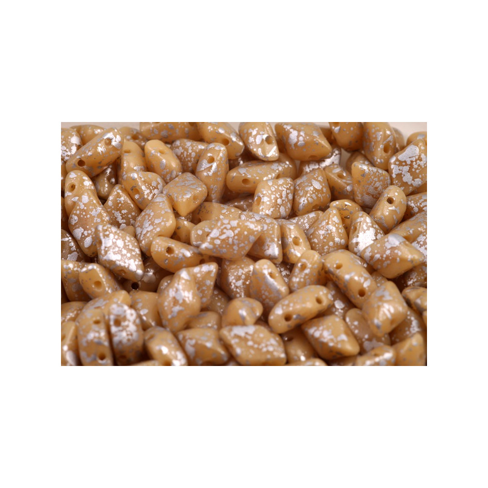 Gli accenti metallici argentati su una base cremosa offrono una tavolozza versatile che unisce l'estetica classica a quella contemporanea. Si abbina magnificamente a toni neutri come il jet black o il crystal clear per evidenziare l'effetto splash luminoso. Queste perline lavorano armoniosamente anche con le perline ceche Mezzi cristalli, che possono essere utilizzate come accenti d'angolo scintillanti in composizioni GemDuo complesse.